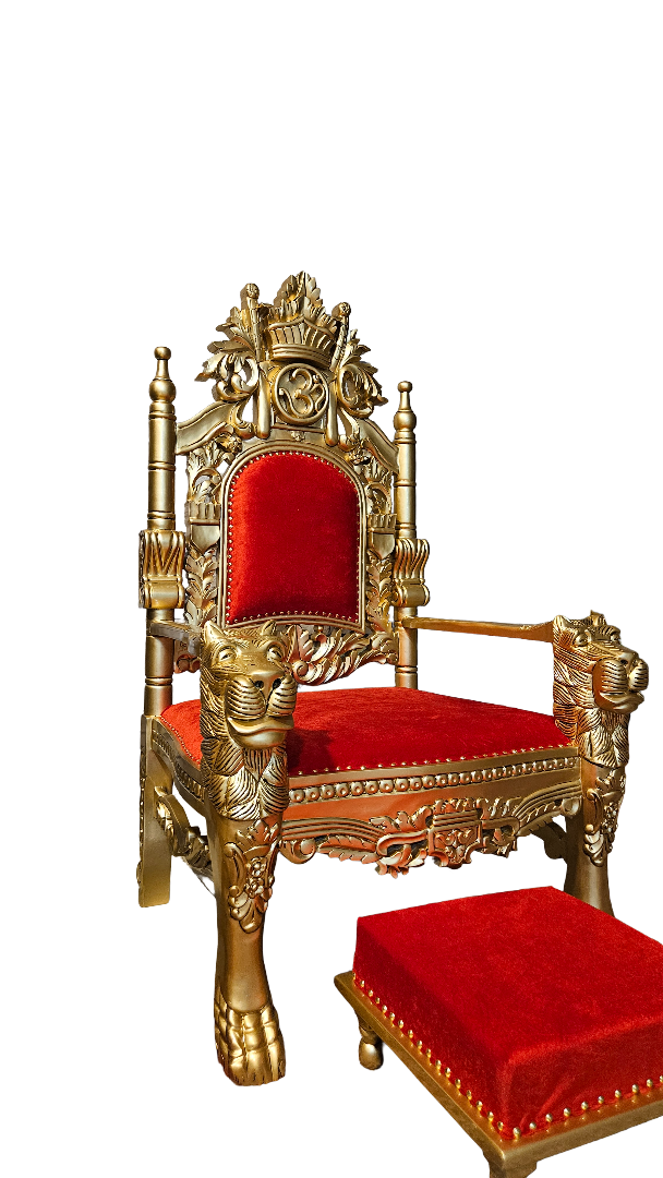 The chair comes with a matching footrest and side tables, completing the set’s luxurious and devotional look. Every detail reflects craftsmanship and spiritual grace, making it not only a chair but a throne of respect and reverence.